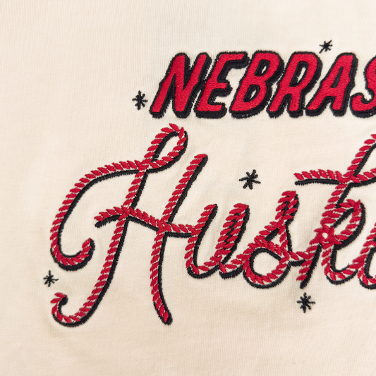sold out. bummer!Cream “Nebraska Huskers" Lasso Embroidered Luxe Heavyweight Crop Tee