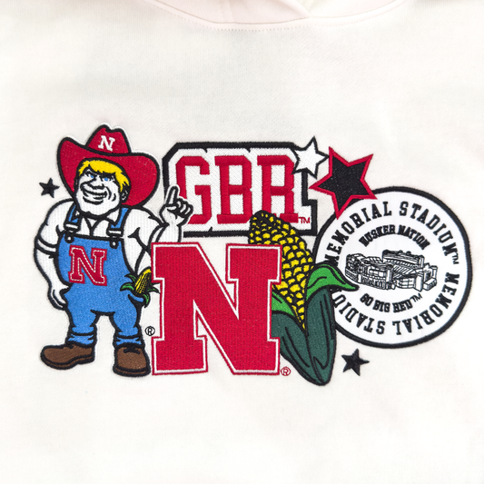 sold out. bummer!White Nebraska Husker “GBR" Layered Patch Luxe Crop Hoodie