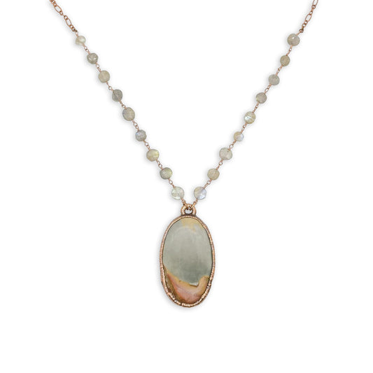 Oval Sandhills Picture Jasper Pendant Necklace on 18″ Labradorite Beaded Copper Chain
