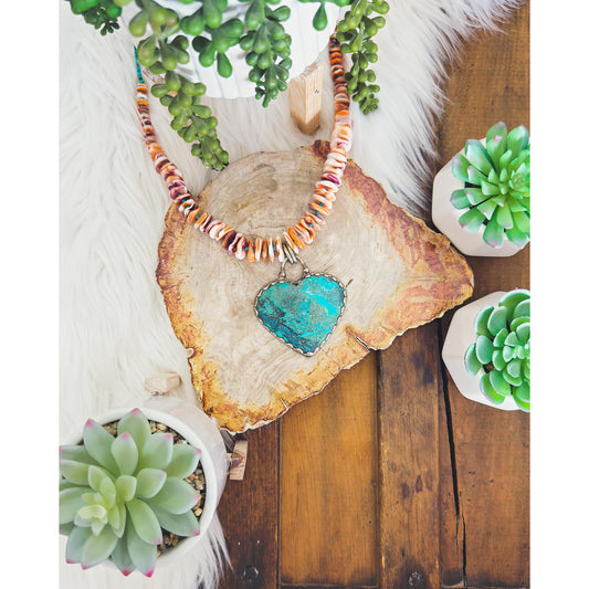 Sicangu Lakota Oyate Turquoise Heart Pendant Necklace with Spiny Oyster and Nevada Blue Turquoise Heishi Beads