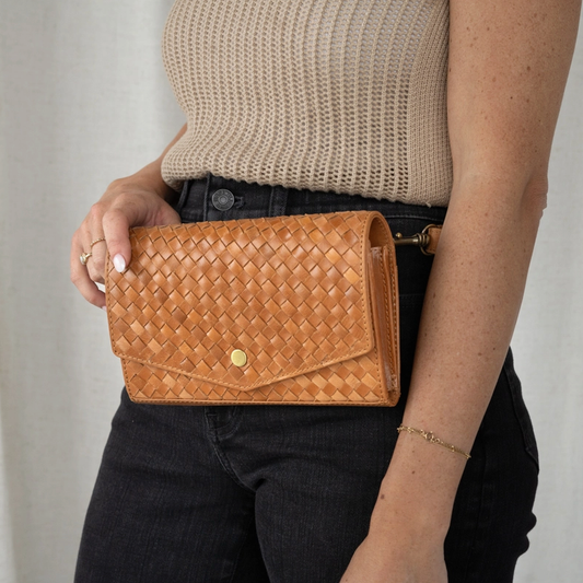 sold out. bummer!Camel Full Grain Leather Woven Dimarco Crossbody Bag