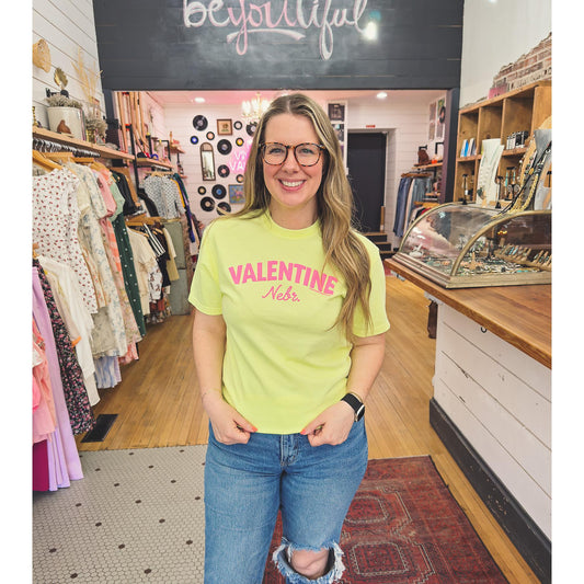 Neon Yellow “Valentine, Nebr” Puff Print Garment-Dyed Heavyweight Graphic Tee