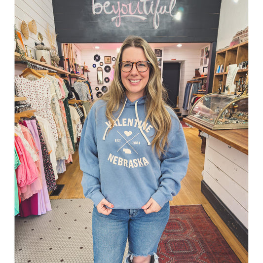 Blue Jean “Valentine Nebraska, Est: 1884” Garment-Dyed Lightweight Fleece Hooded Graphic Sweatshirt