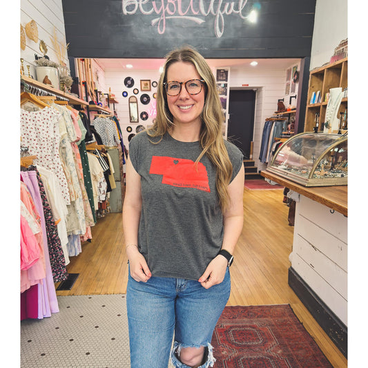 Dark Grey Heather “Small Town. Big Heart.” Valentine, Nebraska State Women’s Flowy Rolled Cuffs Muscle Graphic Tee