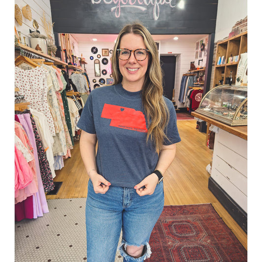 Dark Denim “Small Town. Big Heart.” Valentine, Nebraska State Women's Relaxed Boxy Graphic Tee