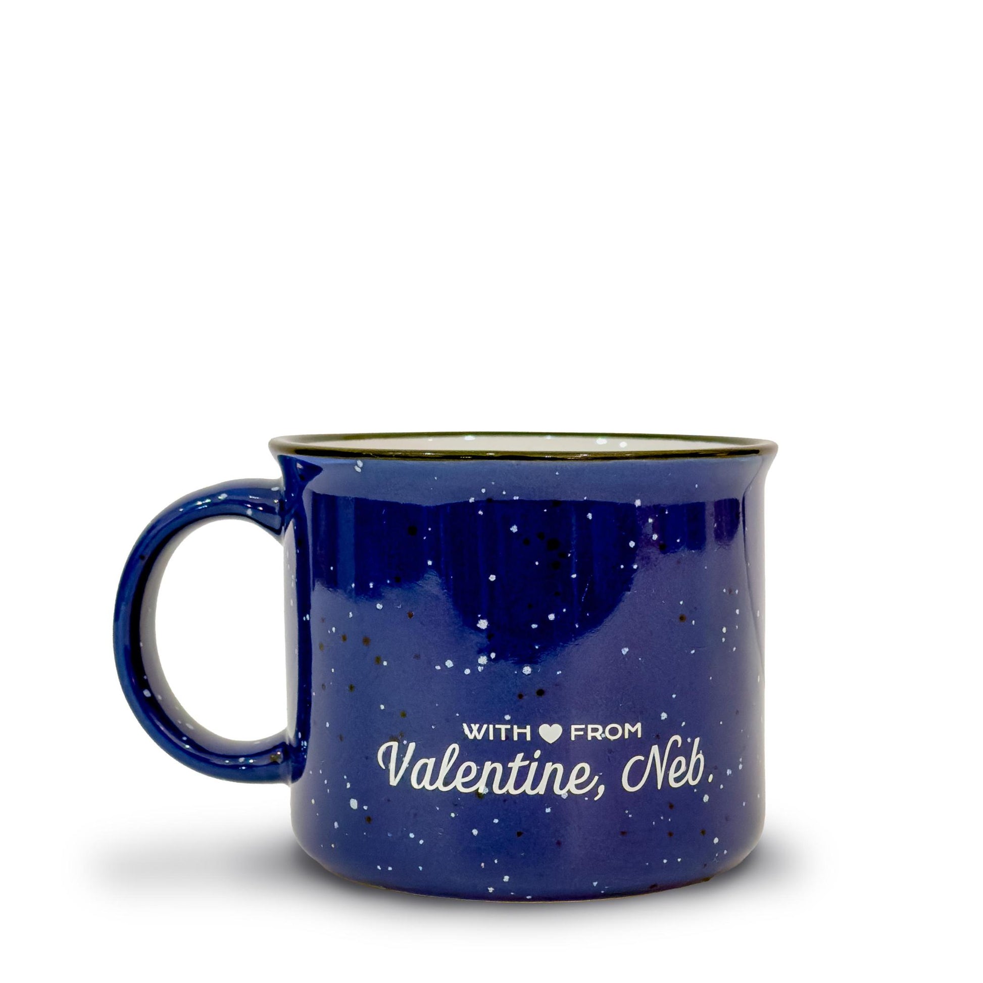 These amazing ceramic campfire-style mugs have our exclusive design with the state of Nebraska in white that has a heart over the Heart City itself, Valentine, and says “Small Town. Big Heart.” on the bottom of the state. The back of the mugs say “With 🖤 From Valentine, Neb.”.