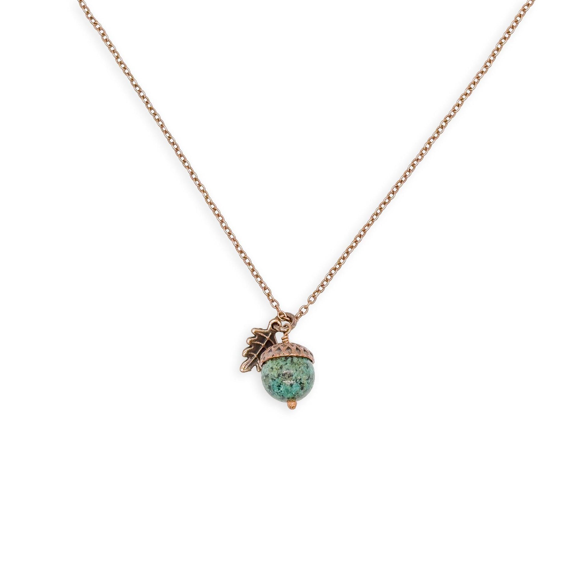 African Turquoise Acorn Pendant Necklace with Copper Leaf on 20″ Copper Chain