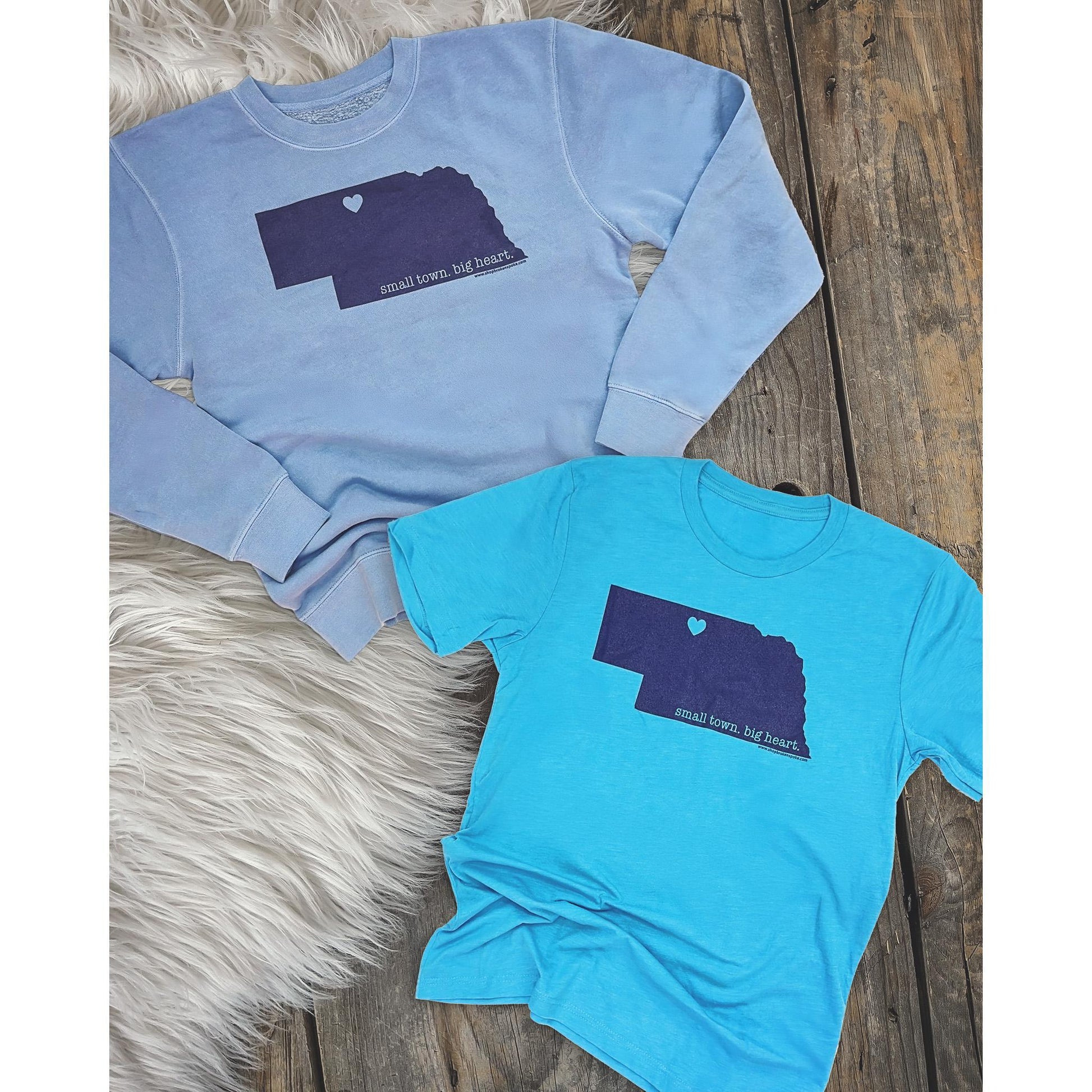 Our best selling Broken Spoke Boutique exclusive design is back in a graphic tee that you need in your closet! Not only is this design perfect for the local community but for anyone that loves this small, amazing town. This unisex tee has a navy hand-screened design of the state of Nebraska with a heart over Valentine that says “Small Town. Big Heart.” on a garment dyed 'aquifer' blue color.