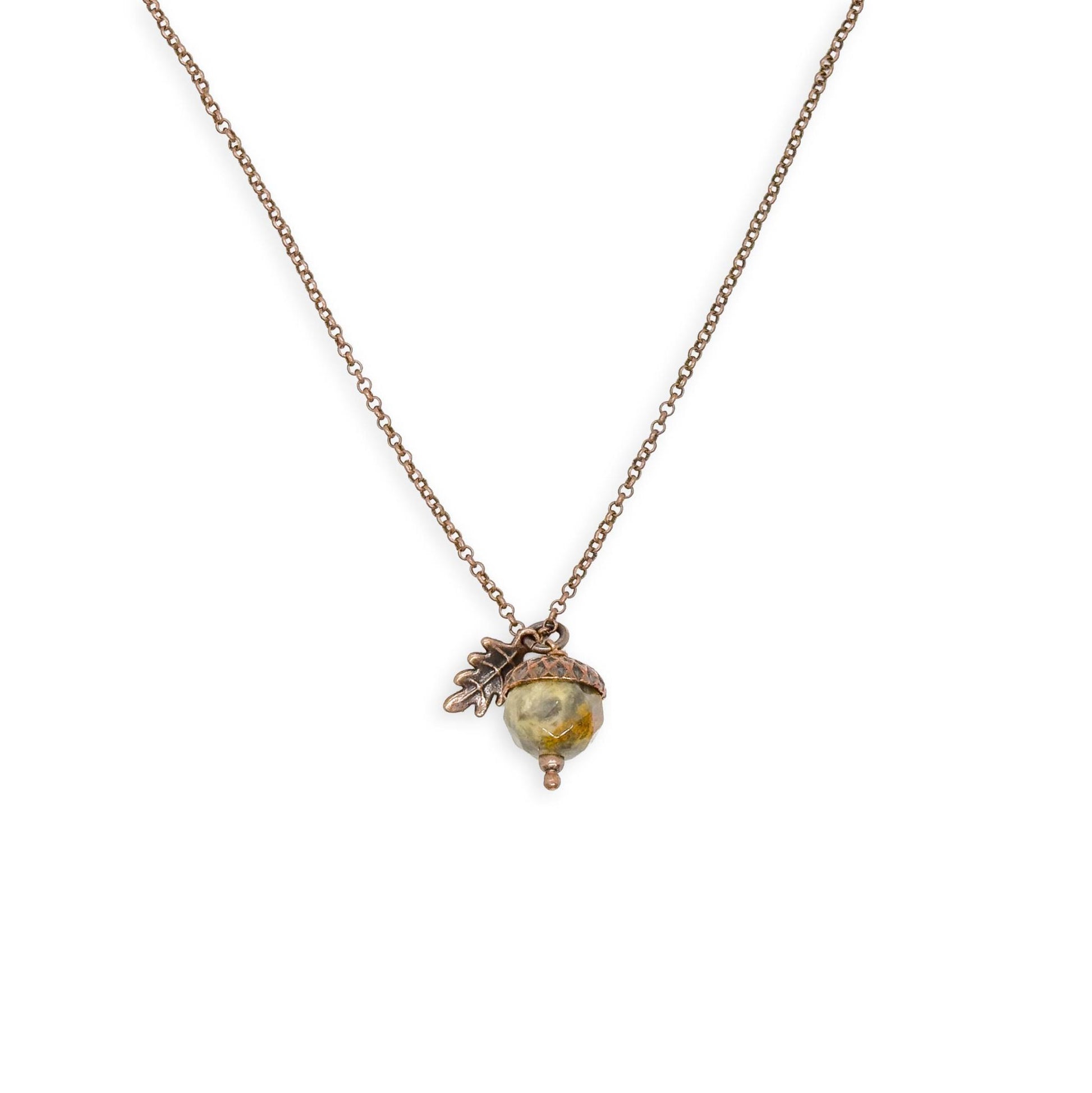 Crazy Lace Agate Acorn Pendant Necklace with Copper Leaf on 20″ Copper Chain