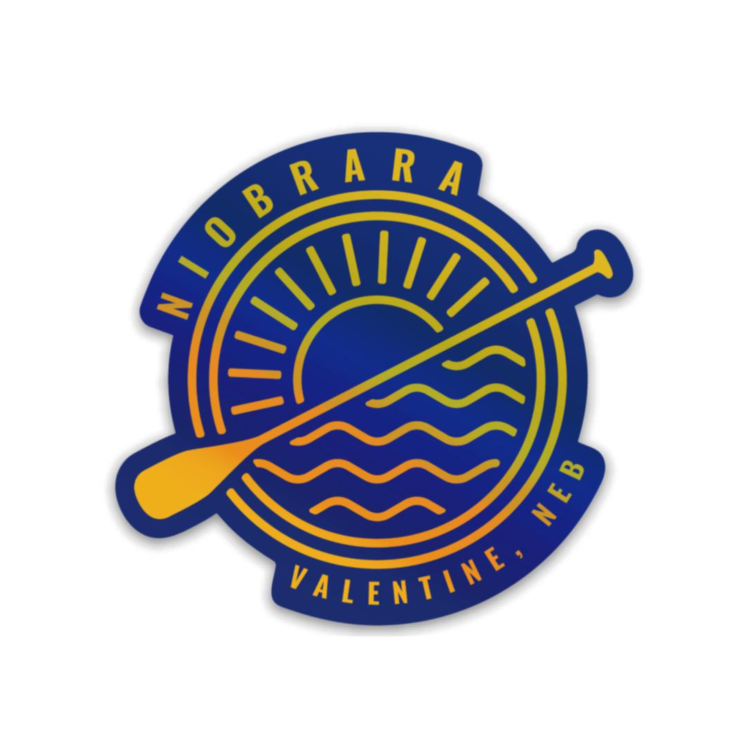 This amazing exclusive sticker has a navy & gold design of an oar separating the Sandhills sunshine from the river water, and says “Niobrara Valentine, Neb”.