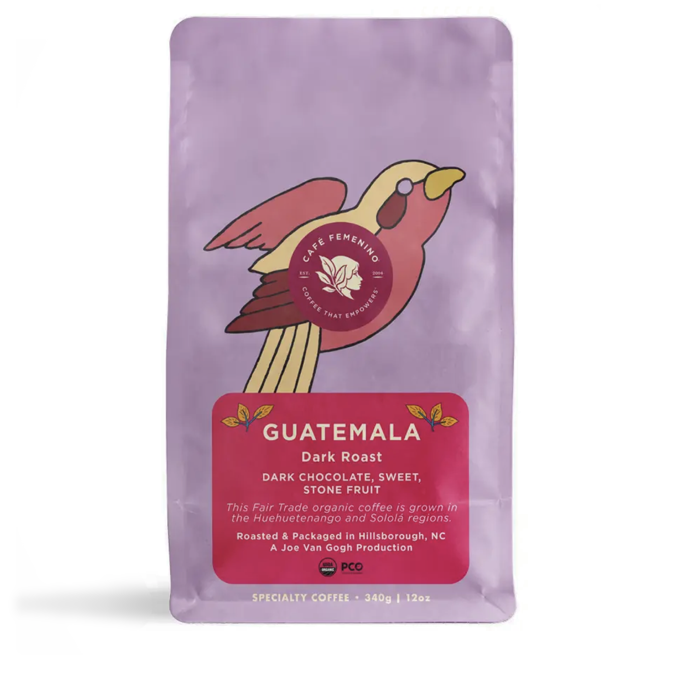 This Fair Trade organic coffee is grown on farms owned and operated by women producers located in the Huehuetenango and Sololá regions of Guatemala.