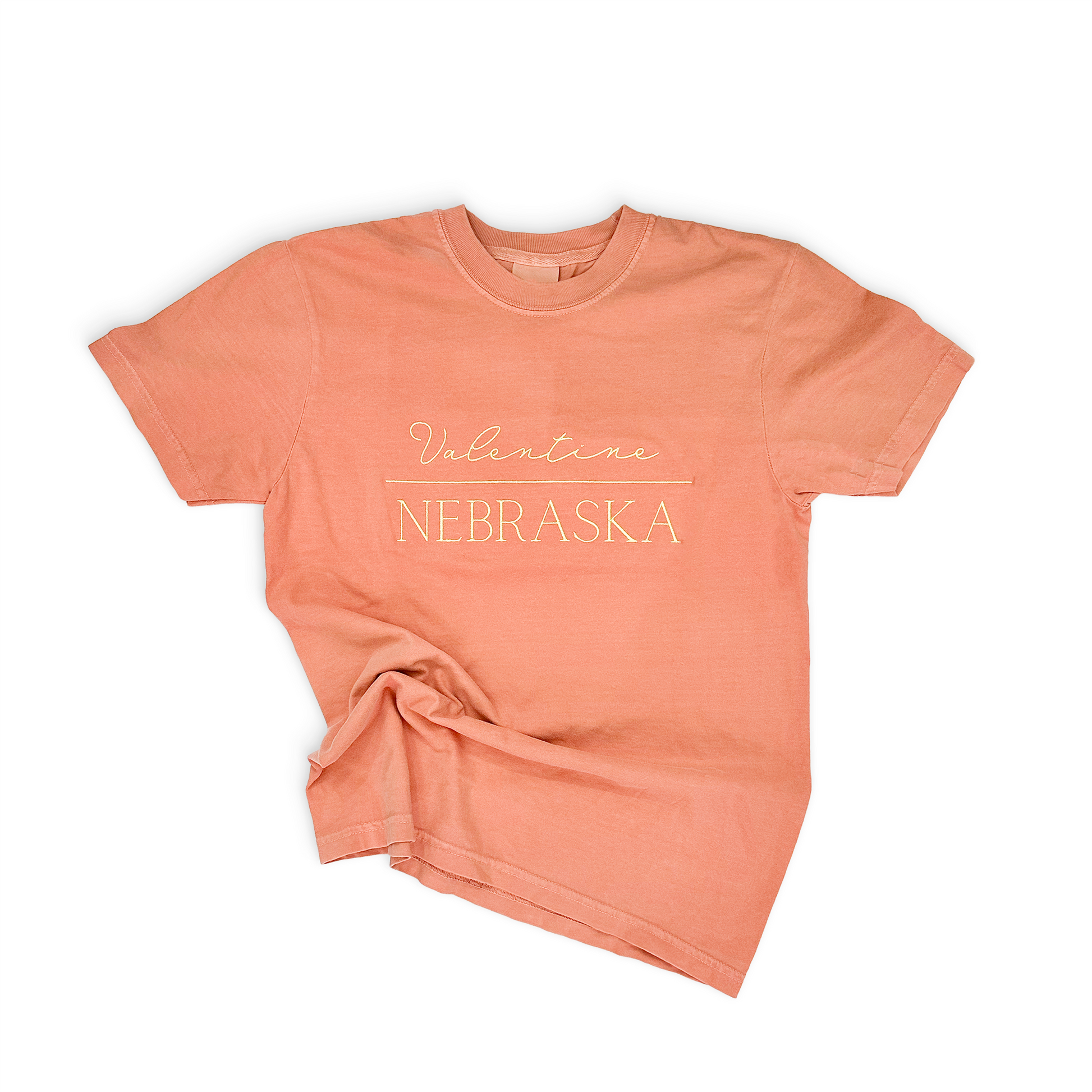 This heavy-weight graphic tee has an embroidered light yellow design that says “Valentine Nebraska” on a terracotta color.