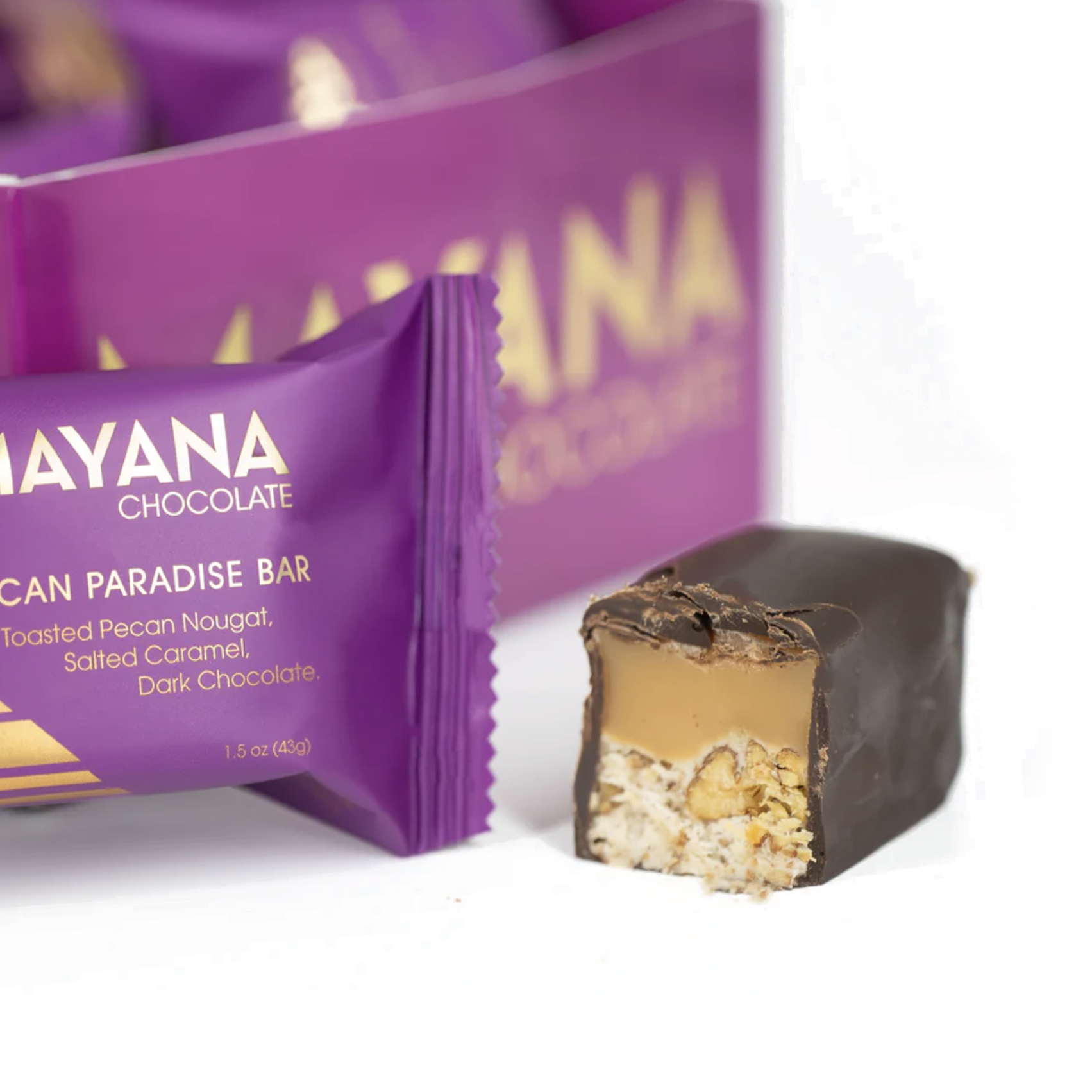 Toasted pecans dance in Mayana's lusciously decadent vanilla nougat, which is expertly layered with their signature salted caramel. Take a bite and step into paradise with their new Pecan Paradise Mini bars!