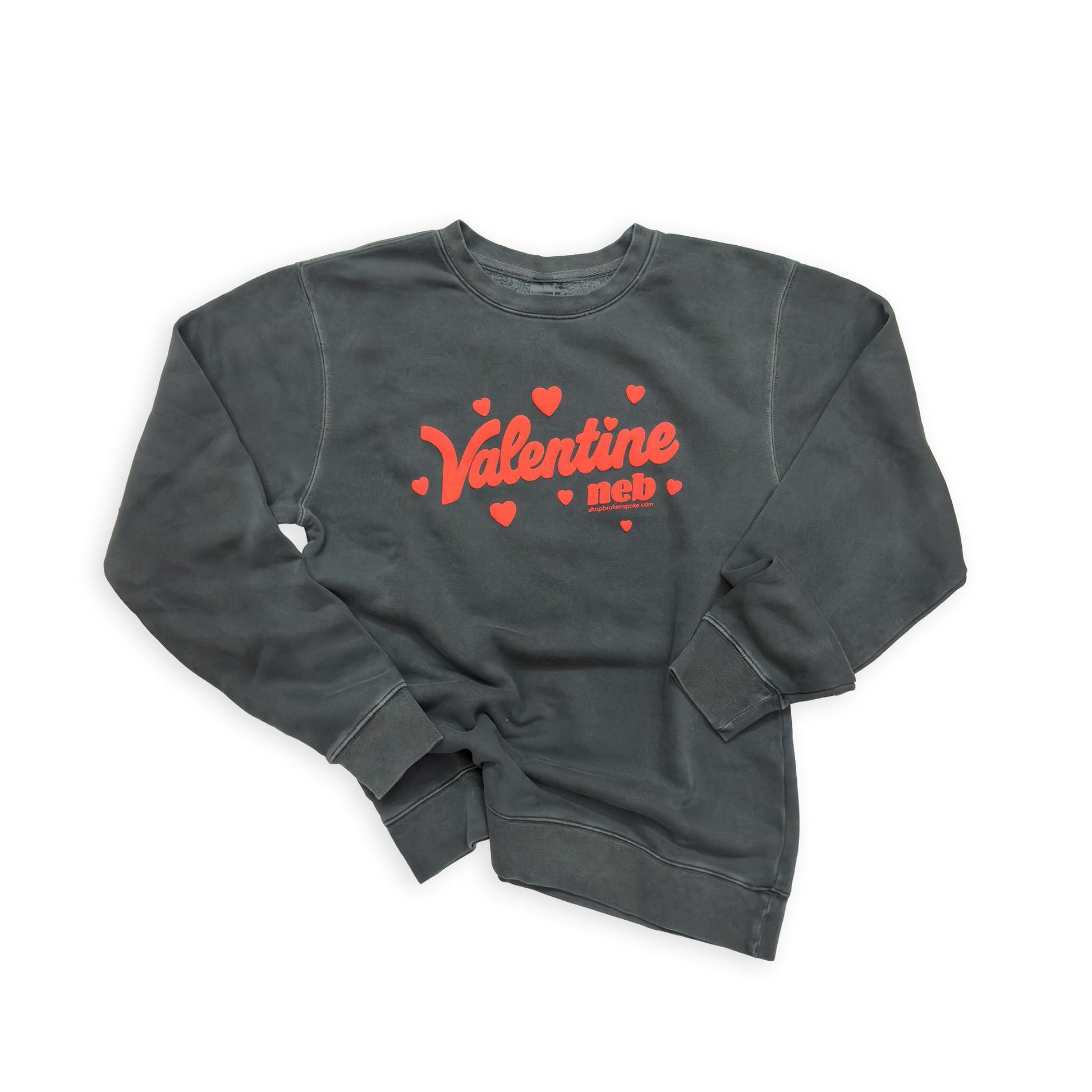 This is the official 2026 Broken Spoke Boutique fifth annual Valentine Nebraska Valentine's Day design!These incredible pigment-dyed graphic sweatshirts tell you where the heart is: "Valentine Neb" in red puff print with hearts surrounding it. Each sweatshirt is screen printed by hand and designed right here with love in Valentine!